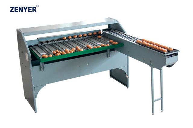 Máquina de clasificación de huevos simple y confiable hecha por ZENYER modelo ZYF-J2L(R/L) (101A). A pesar del bajo precio, es una máquina de clasificación de huevos totalmente profesional con una capacidad de hasta 4 mil huevos por hora.
