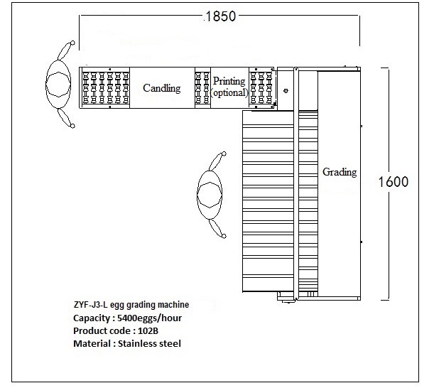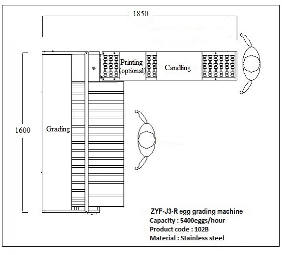 Máquina clasificadora de huevos ZENYER modelo 102B tiene precio bajo y capacidad de producción bastante, seria de 5400 huevos por hora. Material hecha la máquina es acero inoxidable 304 de grado alimenticio. Construido en ovoscopio LED y possible instalar impresora marcadora de huevos. Solo se requieren 2 personas de mantenimiento para operar. Confiable en funcionamiento, fácil de configurar máquina de clasificación de huevos ayudante indispensable para granjas de baja productividad. Antes de pesar y clasificar, se recomienda lavar los huevos.