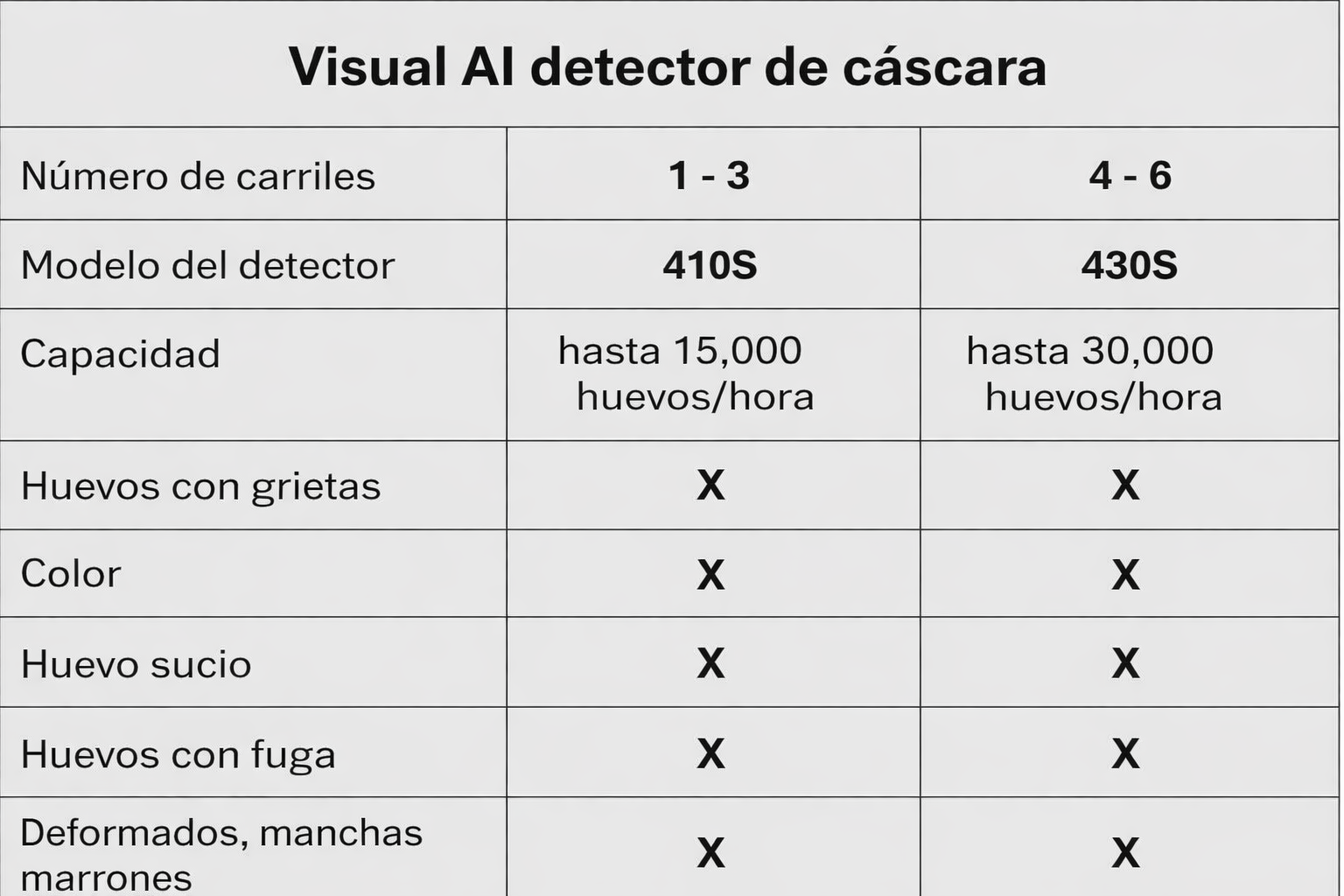- Defectos detectables: grietas y astillas de la cáscara, fugas/filtraciones, suciedad/manchas, cambios de color, huevos deformados o “irregulares” (incluidos moteados), otros defectos visuales; los huevos defectuosos se rechazan automáticamente.